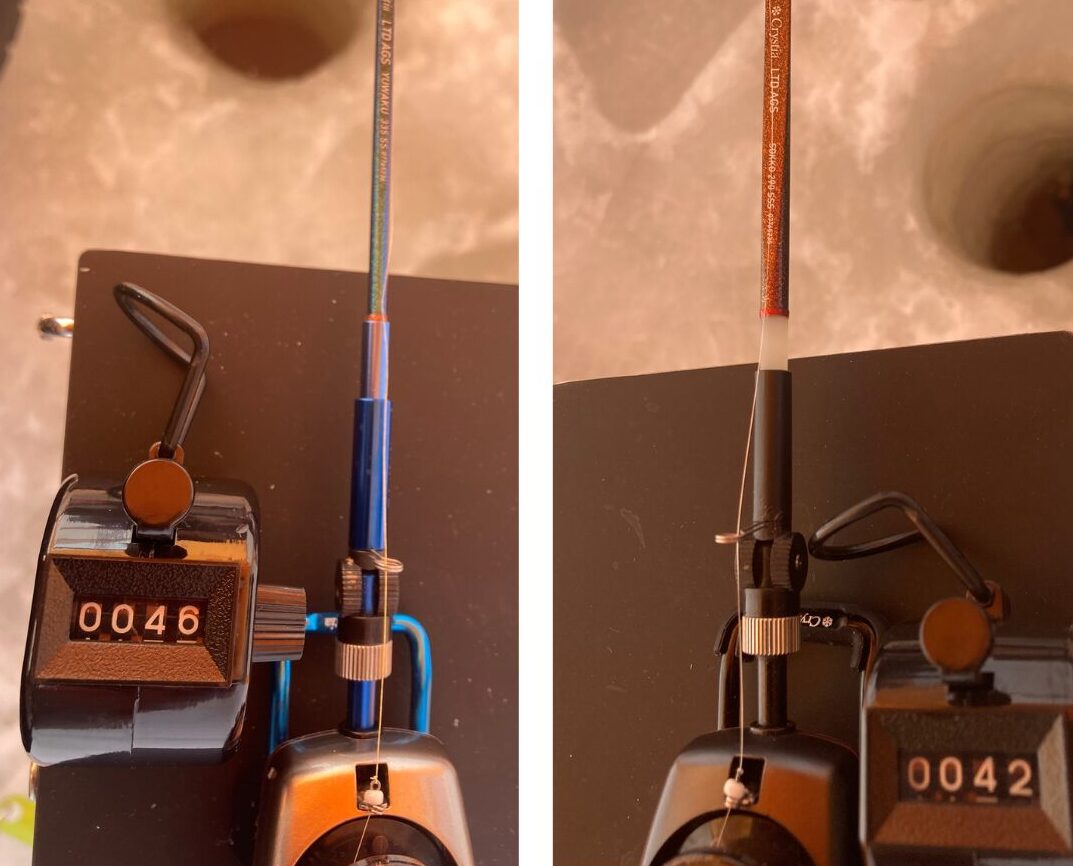 岩洞湖の解禁後は高活性の時期が続くので胴調子の穂先で、多点掛けの手返しを重視した「速攻」を、逆に禁漁時期はほぼ低活性となるため先調子の穂先で、小さなアタリも見逃さない「誘惑」を使ってみることにしました。