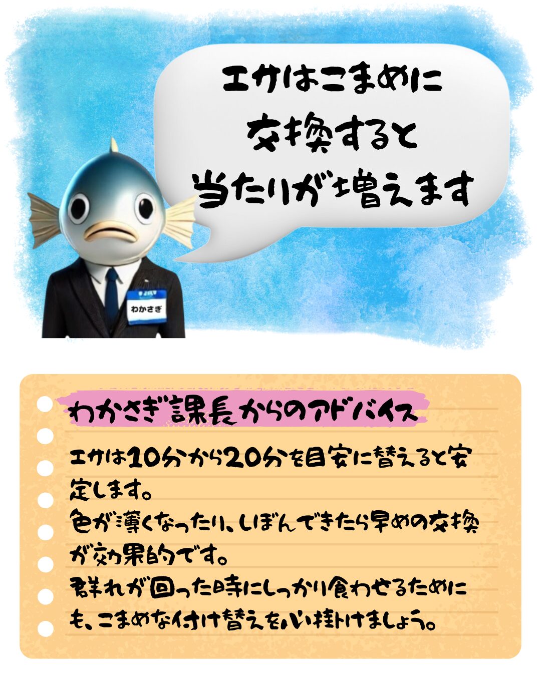 つまり、エサは“化学的アピール・物理的アピール”の両面で劣化するため、こまめに交換することで 摂餌刺激を常に最大化できる というのが専門的な理由です。