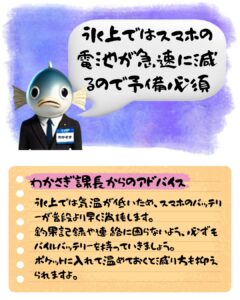氷上ではスマホのリチウムイオン電池が冷えて電圧が急低下し、突然電源が落ちることがあります。低温はバッテリーの苦手分野なので、本体を冷やさないことが最も重要です。内ポケットで温めつつ使い、予備バッテリーを用意しておけば、釣りの最中にスマホが“沈黙”するリスクを大幅に減らせますよ。